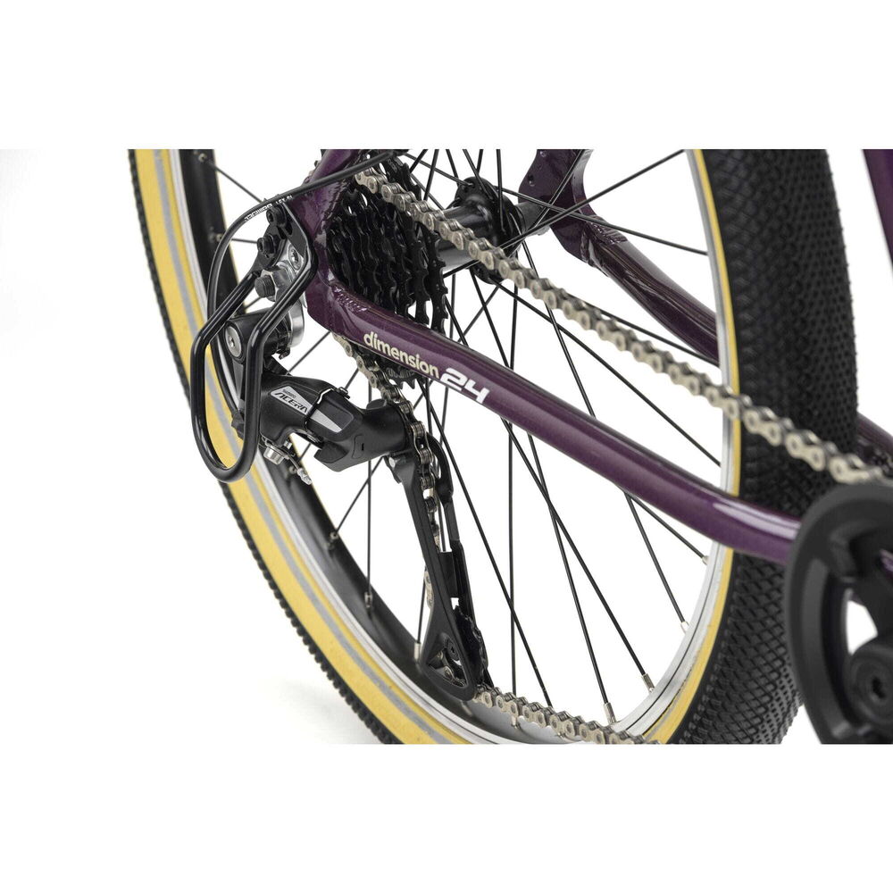 | Product | The Dimension 24 - Lightweight and Ready to Go Further Easy‐Pedal Cranks - Our pedal cranks are ergonomically correct, proportional to the child's leg length. They also place the pedals closer to the bike's centre so that children can pedal as smoothly and naturally as possible. Smaller Grips - Our handlebars and grips are narrower diameter so they fit small hands better, for confidence and control as well as better ability to reach the brakes safely. Faster Tyres ‐ Special edition Nutrak by Vee Speedsters with puncture resistantance. Lowered Frames - Our frames are lower where it counts, making it easier to get on and off and increasing clearance for greater confidence. Steering Limiter - To help prevent falls when learning to co‐ordinate pedalling and cornering, the steering has a limit stop that helps avoid an over‐steering situation. Going further is the name of the game with the Dimension 24! This lightweight kids bike is designed for average height riders aged 8 and upwards who want to see and do more by bike. Bigger horizons, bigger adventures - let's go! Packed with all the easy‐to‐ride and fit‐adjustable features of our almost full‐sized Dimension 27.5, the Dimension 24 punches well above its weight. The light aluminium build keeps things easy to manage, while wide‐range 8‐speed Shimano gears make light work of every hill and headwind along the way. And when it comes to tyres, the Dimension 24 is ready for anything - grippy but easy‐rolling, puncture‐resistant 'gravel' style tyres with reflective sides mean your young adventurer can tackle roads, paths and tracks confidently, whatever the conditions. Rain or shine, day or dusk, the Dimension 24 has got them covered. For adventurous riders ready to push their limits, the Dimension 24 is the perfect lightweight partner for every journey ahead. |