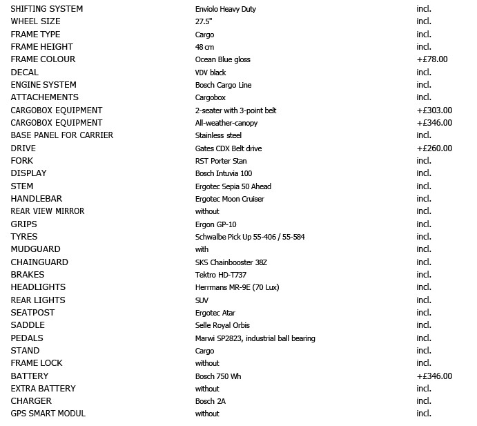| Upgrades | This Cargo bike has had these upgrades: FRAME COLOUR Ocean Blue gloss +£78.00 CARGOBOX EQUIPMENT 2-seater with 3-point belt +£303.00 CARGOBOX EQUIPMENT All-weather-canopy +£346.00 DRIVE Gates CDX Belt drive +£260.00 BATTERY Bosch 750 Wh +£346.00 |