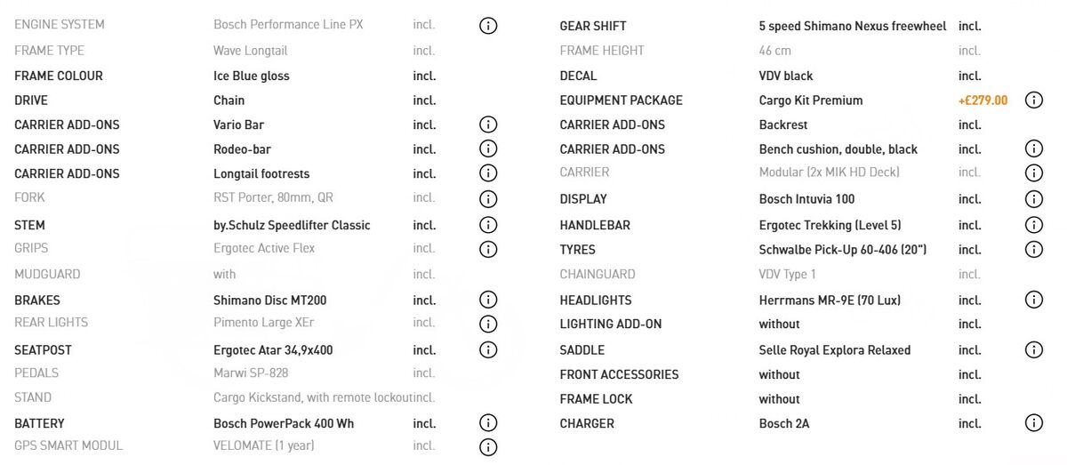 | Upgrades | This upgrade included in the RRP: Cargo Kit Premium +£279.00 Some examples of upgrades : DISPLAY Bosch Kiox 300 +£69.00 DISPLAY Bosch Kiox 500 +£99.00 DISPLAY Bosch Purion 200 +£9.00 BATTERY Bosch Power Pack 545Wh +£259.00 BATTERY Bosch Power Pack 800Wh +£559.00 |