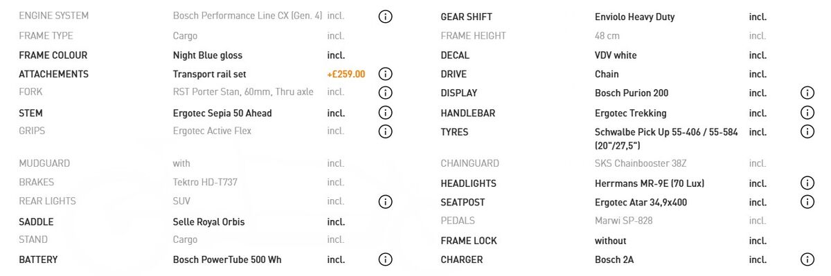 | Upgrades | This upgrade included in the RRP: TRANSPORT RAIL SET +£259.00 Some examples of upgrades : CARGOBOX +£260.00 CARGOBOX EQUIPMENT All-weather-canopy +£259.00 Gear Shift Enviolo Heavy Duty AUTOMATIQ +£339.00 DRIVE Gates CDX Belt drive +£259.00 DISPLAY Bosch Kiox 300 +£89.00 DISPLAY Bosch Kiox 500 +£119.00 BATTERY Bosch PowerTube 625Wh +£169.00 BATTERY Bosch PowerTube 750Wh +£369.00 BATTERY Bosch PowerTube 1000Wh Duel Battery +£899.00 BATTERY Bosch PowerTube 1250Wh Duel Battery +£1239.00 BATTERY Bosch PowerTube 1500Wh Duel Battery +£1629.00 |