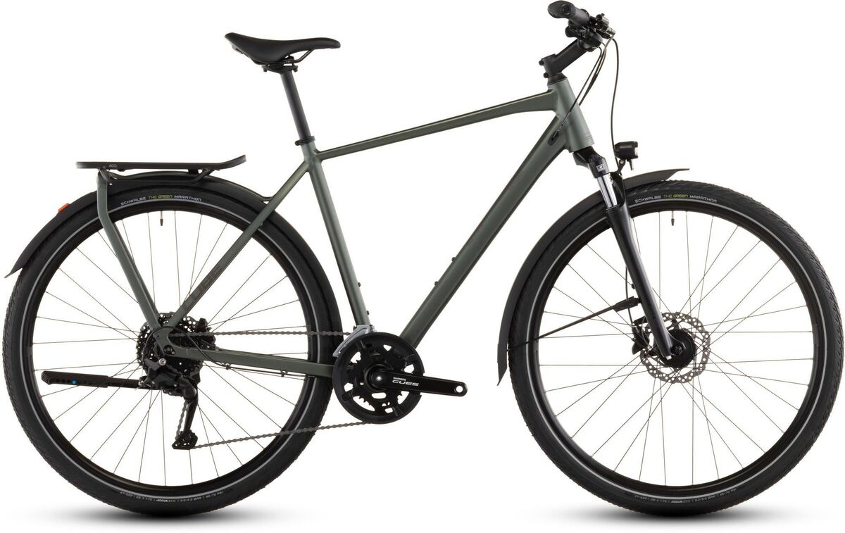 | Product | Have bike will travel. The Kathmandu ONE's understated simplicity belies its ruggedness and adaptability. Take a closer look and you'll spot the sturdy versatile Integrated Carrier 3.0 - the ideal base for carrying whatever you need. Full-length ACID mudguards front and rear lights and a flat mount kickstand are all included. Shimano's easy-to-use 2x9 Cues gears put the right ratio at your fingertips and strong Shimano hydraulic disc brakes ensure you can stop safely in any weather. There's a Suntour suspension fork to help smooth even rough roads and the Schwalbe Green Marathon tyres use recycled rubber in their construction to reduce their environmental impact. Where will it take you next? Frame description Attention to detail is a CUBE obsession. That's why with the Kathmandu's Integrated Carrier 3.0 we designed it to work seamlessly with our ACID mudguard. We've fitted a flat mount for the rear disc brake - it also accommodates the kickstand - and used Smooth Welding to give the frame joints a tidy organic appearance. But it's not all about looks. We also equipped the rear end with a thru-axle and added a tapered head tube for improved rigidity and steering precision even when fully laden. With Internal Cable Routing to complement the frame's clean looks we reckon we've thought of everything. Just don't forget your toothbrush. Attention to detail is a CUBE obsession. That's why with the Kathmandu's Integrated Carrier 3.0 we designed it to work seamlessly with our ACID mudguard. We've fitted a flat mount for the rear disc brake - it also accommodates the kickstand - and used Smooth Welding to give the frame joints a tidy organic appearance. But it's not all about looks. We also equipped the rear end with a thru-axle and added a tapered head tube for improved rigidity and steering precision even when fully laden. With Internal Cable Routing to complement the frame's clean looks we reckon we've thought of everything. Just don't forget your toothbrush. Frame: Aluminium Superlite Trekking Comfort Integrated Carrier 3.0 Double Butted Fork: SR Suntour NEX 63mm Headset: VP Integrated Top 1 1/8" Bottom 1 1/2" Stem: CUBE Performance Stem SLX 31.8mm Handlebar: CUBE Comfort Trail Bar 680mm Grips: ACID Travel Comfort Rear derailleur: Shimano Cues RD-U4020-SGS 9-Speed Front derailleur: Shimano Cues FD-U4010 Top-Swing 31.8mm Shifters: Shimano Cues SL-U4010- Rapidfire-Plus Brake system: Shimano BR-MT200/UR300 Hydr. Disc Brake PM/FM (160) Bottom Bracket: Shimano BB-MT501 68mm BSA Crankset: Shimano Cues FC-U4010 46x30T Chainguard Crankset chainring sizes: 46x30T Cassette: Shimano CS-LG300 11-36T Number of gears: 18 Chain: KMC xGlide Rims: ACID EX25 32H Disc Tubeless Ready Front hub: Shimano DH-3D37 Hub Dynamo QR Centerlock Rear hub: Shimano FH-TC500-HM 12mm Through Axle Centerlock Tires: Schwalbe Marathon Green Perf 47-622 Pedals: ACID PP Trekking Saddle: ACID Sequence 160 Seat post: CUBE Performance Post 27.2mm Seat post = dropper Yes/No: NO Front light: CUBE Shiny 50 Rear light: ACID Mudguard Rear Light PRO-D 6V AC Kickstand: ACID FM Pure Kickstand Mudguard: ACID 56 Integrated Carrier 3.0 Bell: Reich Cycle Bells Ringsound Carrier: ACID Integrated Carrier 3.0 CUBE Adapter Compatible |