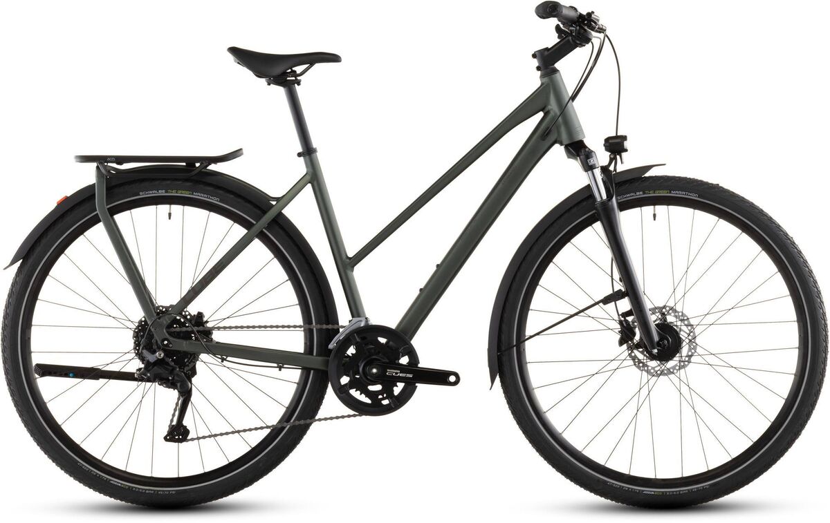 | Product | Have bike will travel. The Kathmandu ONE's understated simplicity belies its ruggedness and adaptability. Take a closer look and you'll spot the sturdy versatile Integrated Carrier 3.0 - the ideal base for carrying whatever you need. Full-length ACID mudguards front and rear lights and a flat mount kickstand are all included. Shimano's easy-to-use 2x9 Cues gears put the right ratio at your fingertips and strong Shimano hydraulic disc brakes ensure you can stop safely in any weather. There's a Suntour suspension fork to help smooth even rough roads and the Schwalbe Green Marathon tyres use recycled rubber in their construction to reduce their environmental impact. Where will it take you next? Frame description CUBE design expertise is the name of the game for the Kathmandu's Trapeze frame. Its Integrated Carrier 3.0 is designed to work seamlessly with our ACID mudguard. We've fitted a flat mount for the rear disc brake - it also accommodates the kickstand - and used Smooth Welding to give the frame joints a tidy organic appearance. But it's not all about looks. We also equipped the rear end with a thru-axle and added a tapered head tube for improved rigidity and steering precision even when fully laden. With Internal Cable Routing to complement the frame's clean lines we reckon we've thought of everything. Just don't forget your toothbrush. CUBE design expertise is the name of the game for the Kathmandu's Trapeze frame. Its Integrated Carrier 3.0 is designed to work seamlessly with our ACID mudguard. We've fitted a flat mount for the rear disc brake - it also accommodates the kickstand - and used Smooth Welding to give the frame joints a tidy organic appearance. But it's not all about looks. We also equipped the rear end with a thru-axle and added a tapered head tube for improved rigidity and steering precision even when fully laden. With Internal Cable Routing to complement the frame's clean lines we reckon we've thought of everything. Just don't forget your toothbrush. Frame: Aluminium Superlite Trekking Comfort Integrated Carrier 3.0 Double Butted Fork: SR Suntour NEX 63mm Headset: VP Integrated Top 1 1/8" Bottom 1 1/2" Stem: CUBE Performance Stem SLX 31.8mm Handlebar: CUBE Comfort Trail Bar 680mm Grips: ACID Travel Comfort Rear derailleur: Shimano Cues RD-U4020-SGS 9-Speed Front derailleur: Shimano Cues FD-U4010 Top-Swing 31.8mm Shifters: Shimano Cues SL-U4010- Rapidfire-Plus Brake system: Shimano BR-MT200/UR300 Hydr. Disc Brake PM/FM (160) Bottom Bracket: Shimano BB-MT501 68mm BSA Crankset: Shimano Cues FC-U4010 46x30T Chainguard Crankset chainring sizes: 46x30T Cassette: Shimano CS-LG300 11-36T Number of gears: 18 Chain: KMC xGlide Rims: ACID EX25 32H Disc Tubeless Ready Front hub: Shimano DH-3D37 Hub Dynamo QR Centerlock Rear hub: Shimano FH-TC500-HM 12mm Through Axle Centerlock Tires: Schwalbe Marathon Green Perf 47-622 Pedals: ACID PP Trekking Saddle: ACID Sequence 160 Seat post: CUBE Performance Post 27.2mm Seat post = dropper Yes/No: NO Front light: CUBE Shiny 50 Rear light: ACID Mudguard Rear Light PRO-D 6V AC Kickstand: ACID FM Pure Kickstand Mudguard: ACID 56 Integrated Carrier 3.0 Bell: Reich Cycle Bells Ringsound Carrier: ACID Integrated Carrier 3.0 CUBE Adapter Compatible |